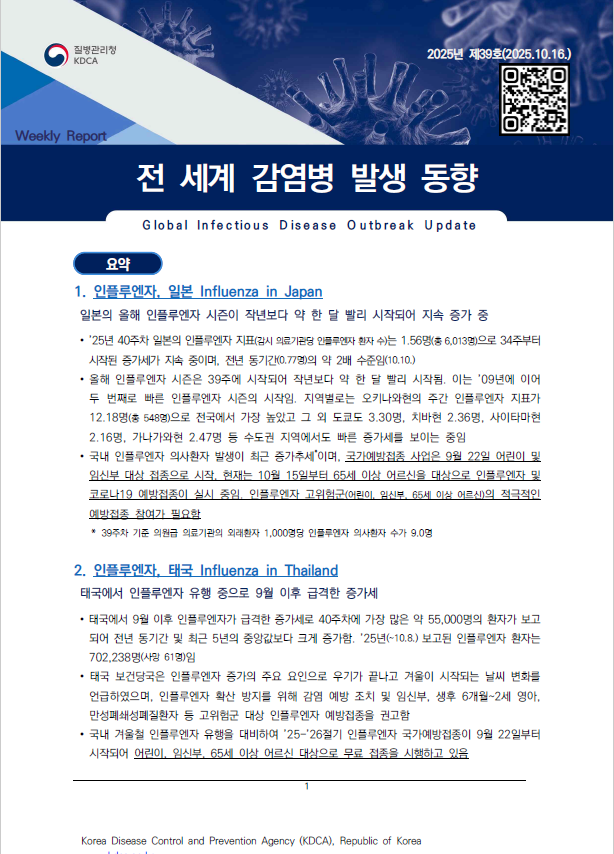 전 세계 감염병 발생 동향 제39호(2025.10.16.)