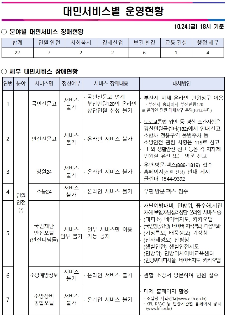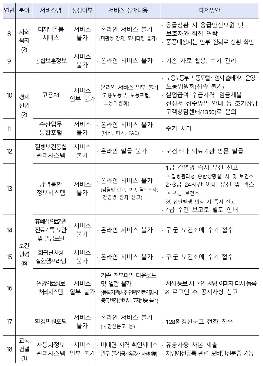 서비스 복구 현황 및 공식 안내는 각 부처와 기관의 공식 홈페이지 공지사항에서만 확인해 주시기 바랍니다.