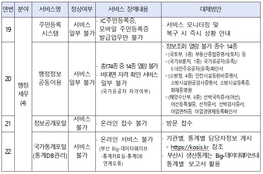 국가정보자원관리원 전산시설 화재발생으로 인한 부산시 시스템 일부 서비스 중단 안내