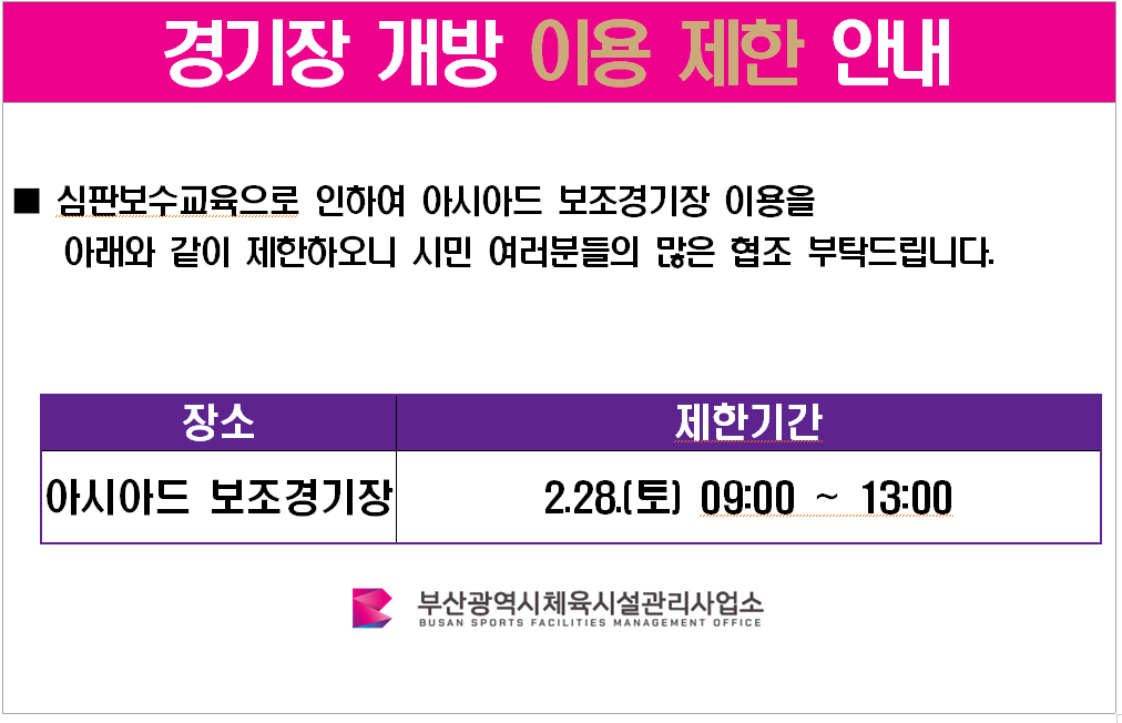 아시아드 보조경기장 이용제한 안내(2.28.)