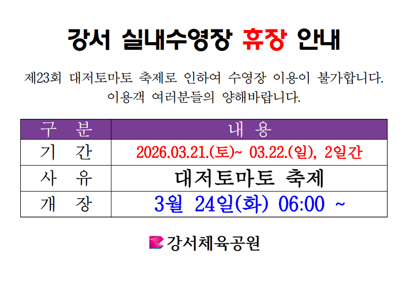[강서체육공원] 수영장 휴장 안내