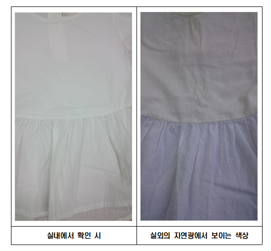 소비자는 자녀에게 입히기 위해 주름 치마 단이 붙은 흰색 상의를 구입했다. 소비자는 구입 당시 인지하지 못했으나, 착용 후 햇빛 아래에서 상품 확인 시 몸판과 치마단의 색상 차이가 심하여 문제를 제기했다.