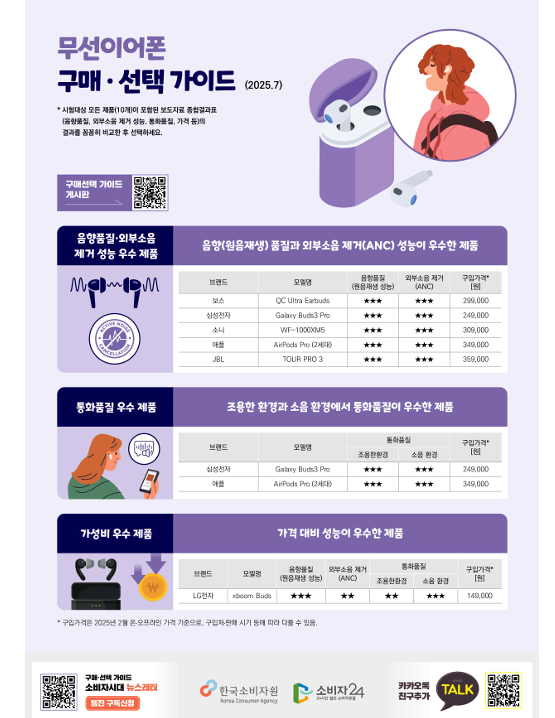 한국소비자원(원장 윤수현)이 소비자의 제품 구매·선택을 돕기 위해 시중에 유통 중인 무선이어폰 10개 제품의 품질(음향품질, 외부소음 제거 성능, 통화품질, 연속 재생시간, 지연시간 등)과 안전성(최대음량, 정전기내성) 등을 시험평가했다. 시험평가 결과 음향품질(원음재생 성능)·외부소음 제거 성능·통화품질 등 주요 성능과 가격에서 제품 간 차이가 있었고, 일부 제품은 최대음량이 안전기준을 초과해 소비자 주의가 필요한 것으로 나타났다.
