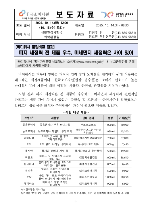 바디워시는 피부에 쌓이는 피지나 먼지 등의 노폐물을 제거하기 위해 사용하는 대표적인 세정제품이다. 한국소비자원(원장 윤수현)은 소비자 선호도가 높은 바디워시 10개 제품에 대해 세정력, 사용감, 안전성, 환경성을 시험‧평가했다.