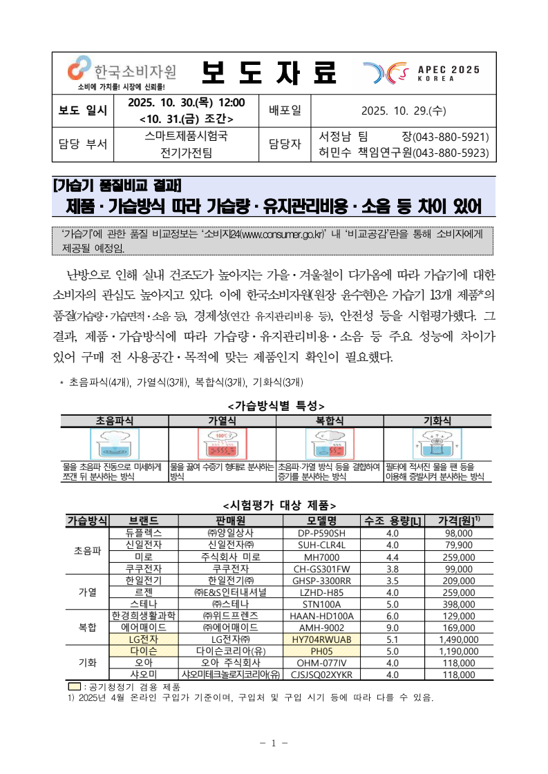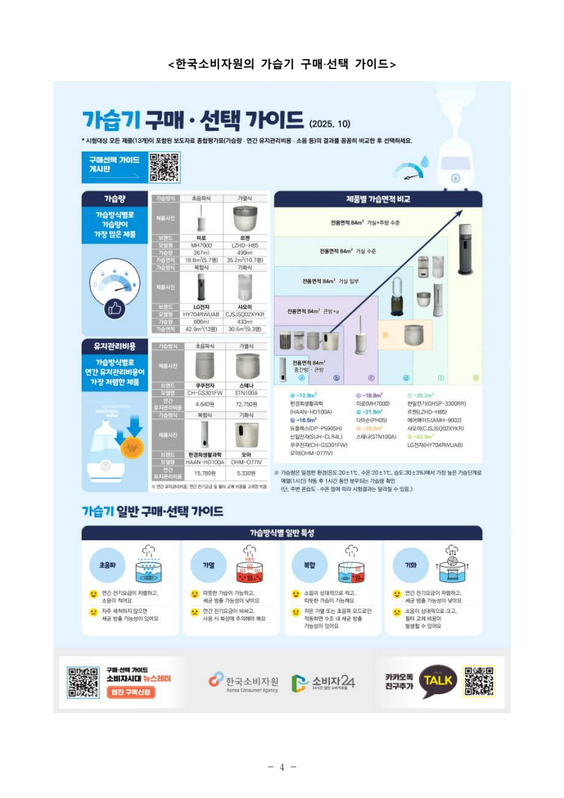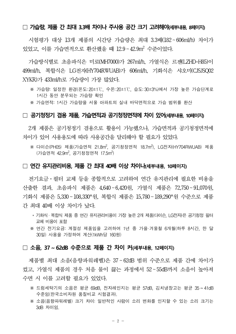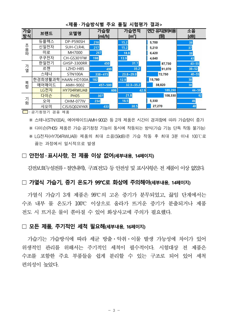 [가습기 품질비교 결과] 제품·가습방식 따라 가습량·유지관리비용·소음 등 차이 있어