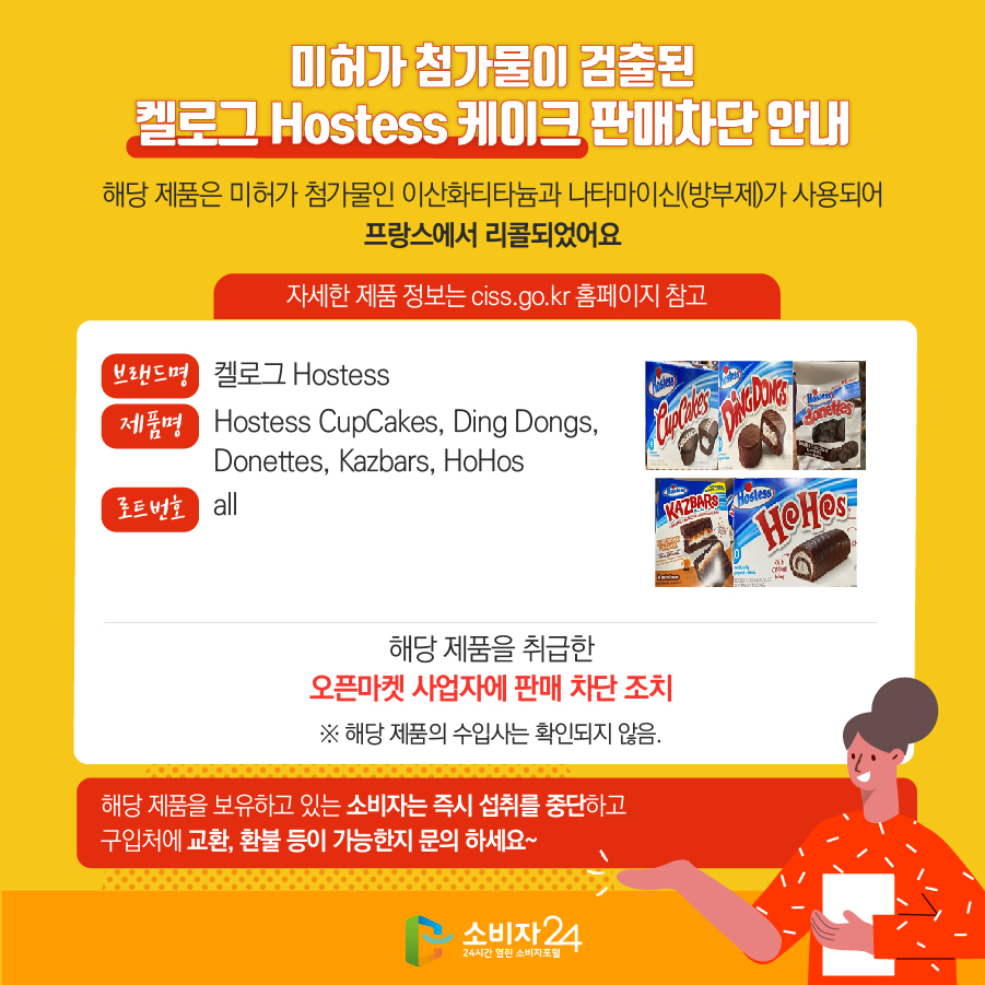 미허가 첨가물이 검출된 켈로그 Hostess 케이크 판매차단 안내