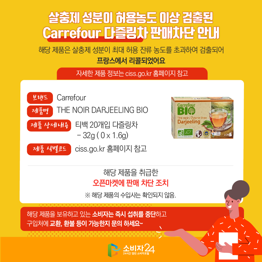 살충제 성분이 허용농도 이상 검출된 Carrefour 다즐링차 판매차단 안내