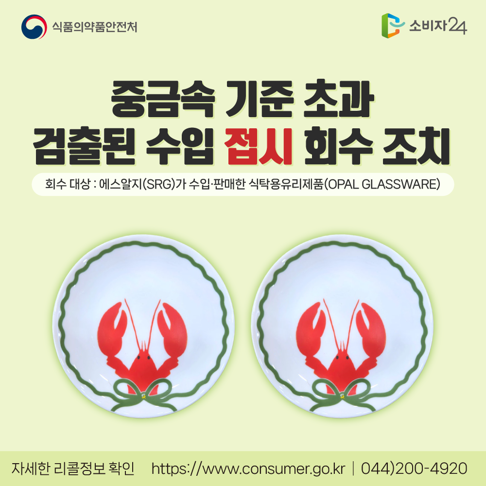 식품의약품안전처(처장 오유경)는 수입식품등 수입판매업체인 ‘에스알지(SRG)(경기도 김포시)’가 수입해 판매한 수입산 ‘식탁용유리제품(OPAL GLASSWARE)’에서 중금속(카드뮴)이 기준치(0.7 ㎍/㎠ 이하) 보다 초과 검출되어 해당 제품을 판매 중단하고 회수 조치한다고 밝혔다.