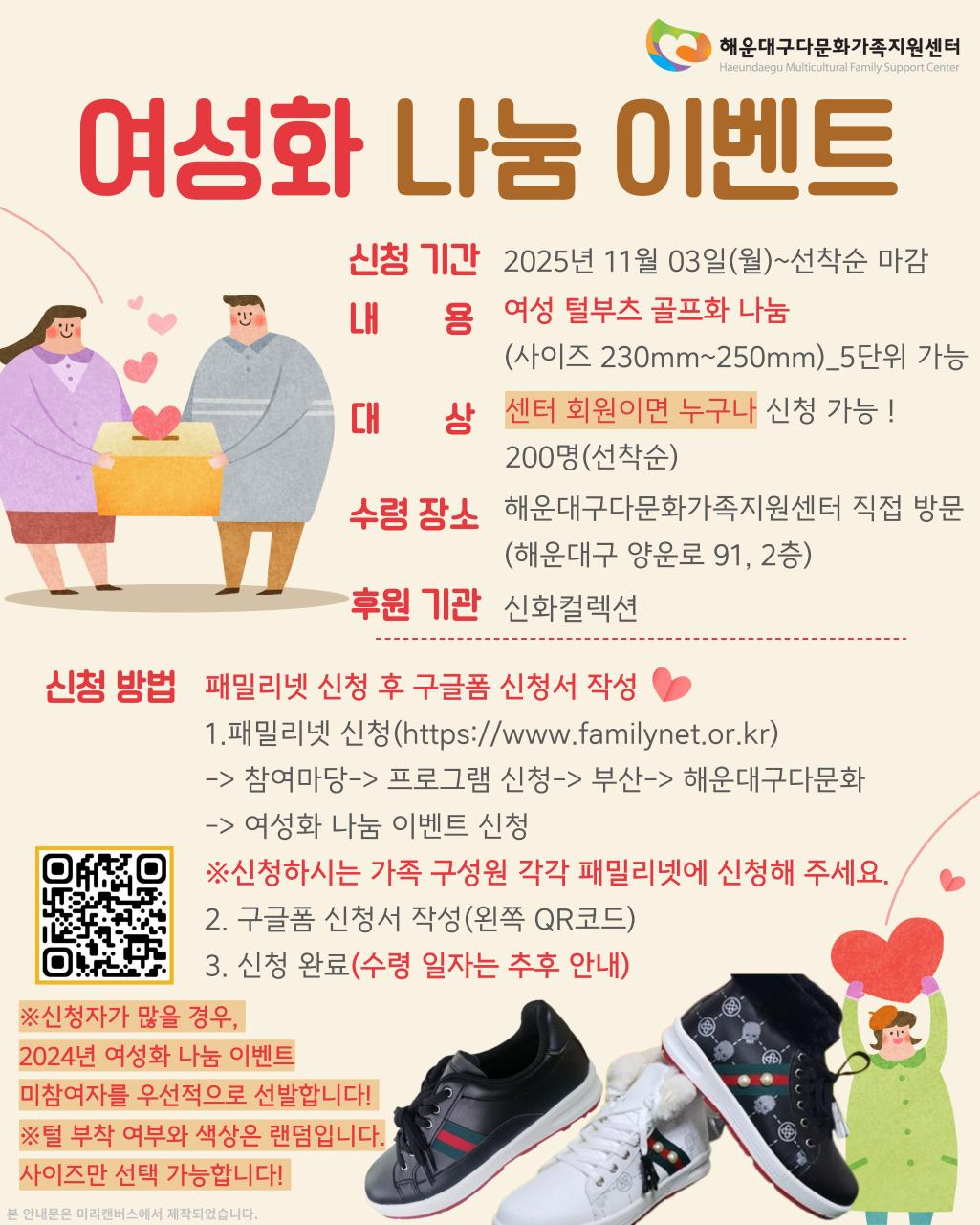 ◆ 신청 기간: 2025년 11월 03일(월)~선착순 마감 ◆ 내용: 여성 털부츠 골프화 나눔 (사이즈 230mm~250mm) 5단위 가능 ◆ 대상: 센터 회원이면 누구나 신청 가능 200명(선착순) ◆ 수령 장소: 해운대구다문화가족지원센터 직접 방문 (해운대구 양운로 91, 2층) ◆ 후원 기관: 신화컬렉션 ◆ 신청 방법: 패밀리넷 신청 후 구글폼 신청서 작성 1. 패밀리넷 신청(https://www.familynet.or.kr)→ 참여마당 → 프로그램 신청 → 부산 → 해운대구다문화 → 여성화 나눔 이벤트 신청 * 신청하시는 가족 구성원 각각 패밀리넷 신청 필요 2. 구글폼 신청서 작성(QR코드) 3. 신청 완료(수령 일자 추후 안내) ※ 신청자가 많을 경우 2024년 여성화 나눔 이벤트 미참여자 우선 선발 ※ 털부츠와 여성화 색상 랜덤 ※ 사이즈 선택 가능 |