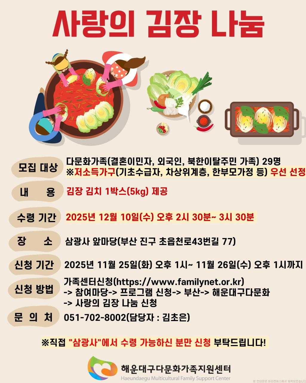 ◆ 모집 대상: 다문화가족(결혼이민자, 외국인, 북한이탈주민 가족) 29명 ※ 저소득가구(기초수급자, 차상위계층, 한부모가정 등) 우선 선정 ◆ 내용: 김장 김치 1박스(5kg) 제공 ◆ 수령 기간: 2025년 12월 10일(수) 오후 2시 30분~3시 30분 ◆ 장소: 삼광사 앞마당(부산 진구 초읍천로 43번길 77) ◆ 신청 기간: 2025년 11월 25일(화) 오후 1시~11월 26일(수) 오후 1시까지 ◆ 신청 방법: 가족센터신청(https://www.familynet.or.kr) → 참여마당 → 프로그램 신청 → 부산 → 해운대구다문화 → 사랑의 김장 나눔 신청 ◆ 문의처: ☎ 051-702-8002 (담당자: 김초은) ※ 직접 "삼광사"에서 수령 가능하신 분만 신청 바랍니다 |