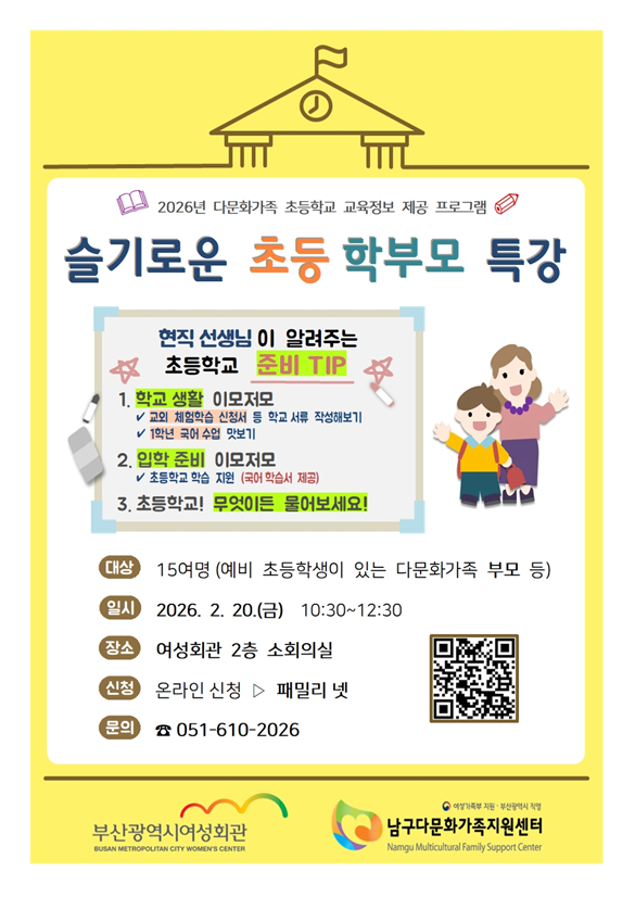 ◆ 내용: 현직선생님이 알려주는 초등학교 준비 TIP 1. 학교생활 이모저모 - 교외 체험학습 신청서 등 학교 서류 작성해보기 - 1학년 국어수업 맛보기 2. 입학 준비 이모저모 - 초등학교 학습 지원 (국어 학습서 제공) 3. 초등학교! 무엇이든 물어보세요! ◆ 대상: 15여명 (예비 초등학생이 있는 다문화가족 부모 등) ◆ 일시: 2026. 2. 20.(금) 10:30~12:30 ◆ 장소: 여성회관 2층 소회의실 ◆ 신청: 온라인 신청 ▷ 패밀리넷 https://busannamgu.familynet.or.kr/center/lay1/program/S295T322C451/recruitReceipt/view.do?seq=241270 ◆ 문의: ☎ 051-610-2026 |