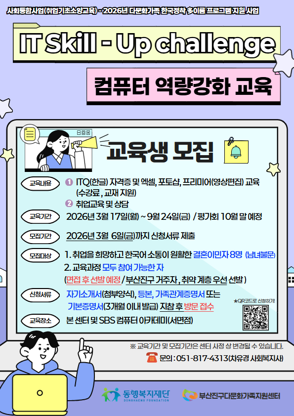 ◆ 모집 대상 1. 취업을 희망하고 한국어 소통이 원활한 결혼이민자 8명(남녀불문) 2. 교육과정 모두 참여 가능한 자 ※ 면접 후 선발 예정(부산진구 거주자, 취약 계층 우선 선발) ◆ 내용 1. ITQ(한글) 자격증 및 엑셀, 포토샵, 프리미어(영상편집) 교육 2. 취업교육 및 상담 ※ 수강료 및 교재 지원 ◆ 교육 기간: 2026년 3월 17일(월) - 9월 24일(금) ※ 평가회: 10월 말 예정 ◆ 장소: 본 센터 및 SBS 컴퓨터 아카데미(서면점) ◆ 신청 기간: 2026년 3월 6일(금)까지 서류 제출 ◆ 신청 방법: 서류 지참 후 방문 접수 → 구비서류: 자기소개서(첨부양식), 등본, 가족관계증명서 또는 기본증명서(3개월 이내 발급) ◆ 문의처: ☎ 051-817-4313(담당자: 차유경 사회복지사) |