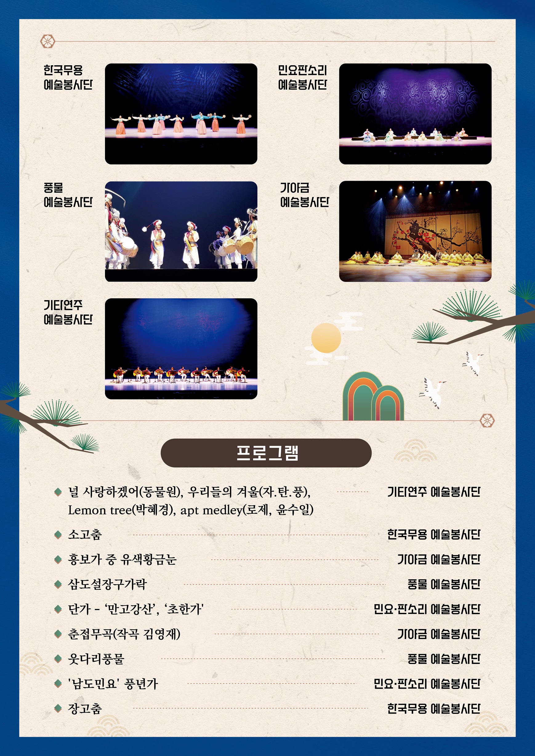 회관 소속 예술봉사단 5개 팀이 준비한 다채로운 전통문화공연이 깊어가는 가을밤을 화려하게 수놓을 예정입니다.