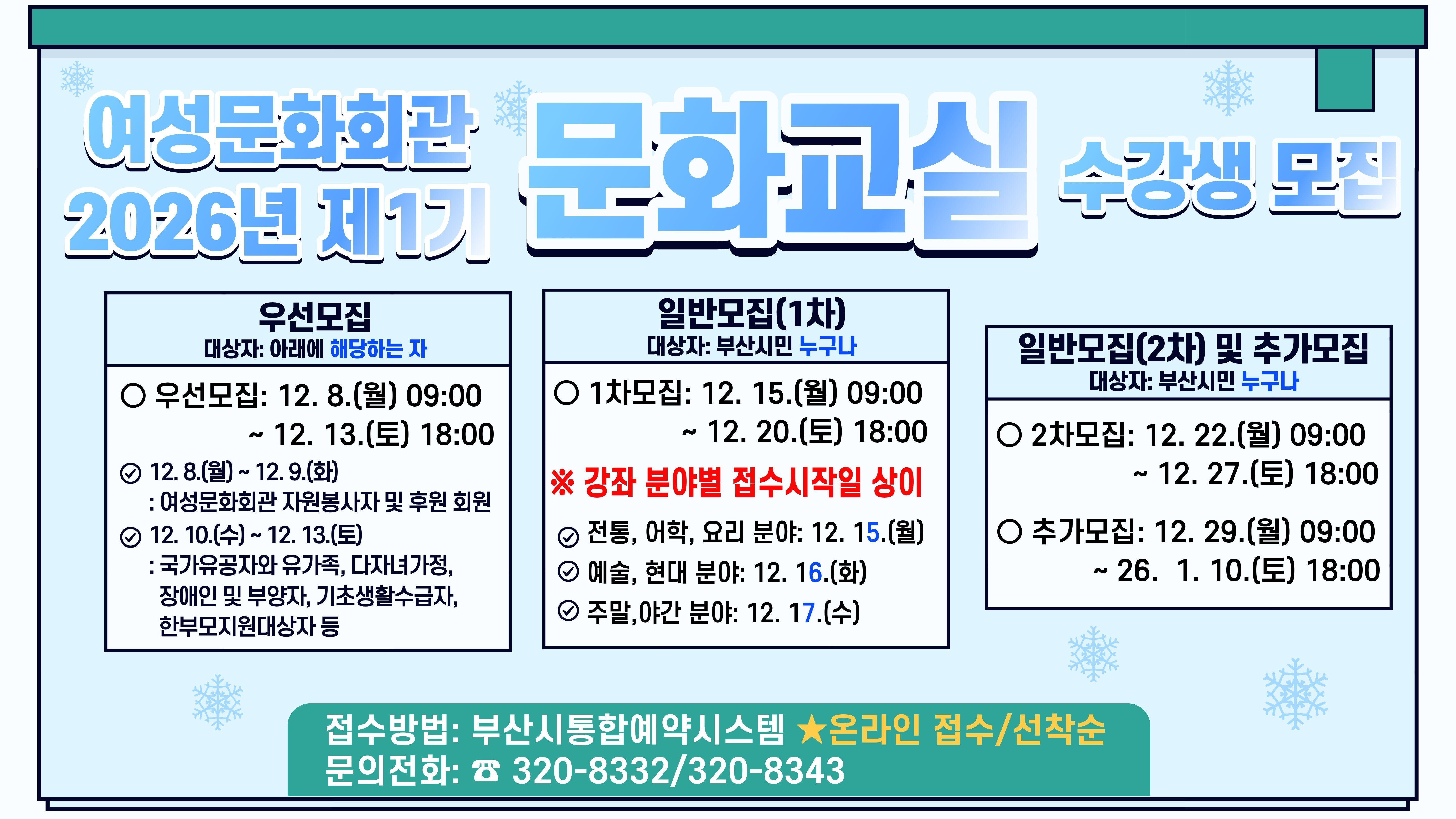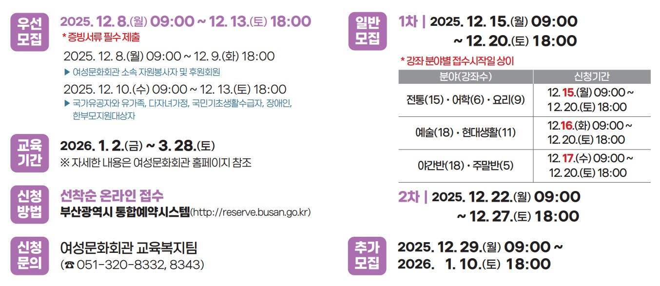 ○ 신청문의: 여성문화회관 교육복지팀(☏ 051-320-8332, 8343)