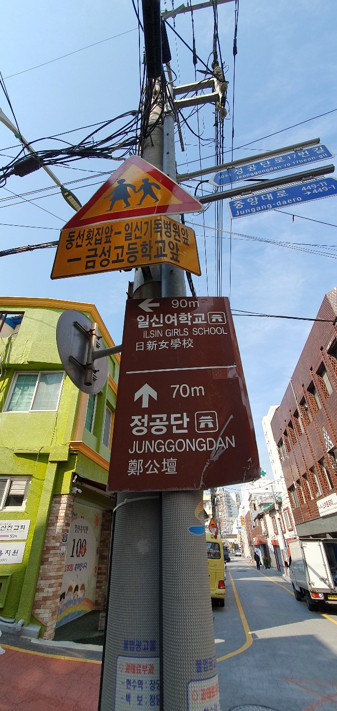(일신여학교를 가리키는 표지판. 인근에는 정발 장군을 기리는 사당인 정공단도 있다.)