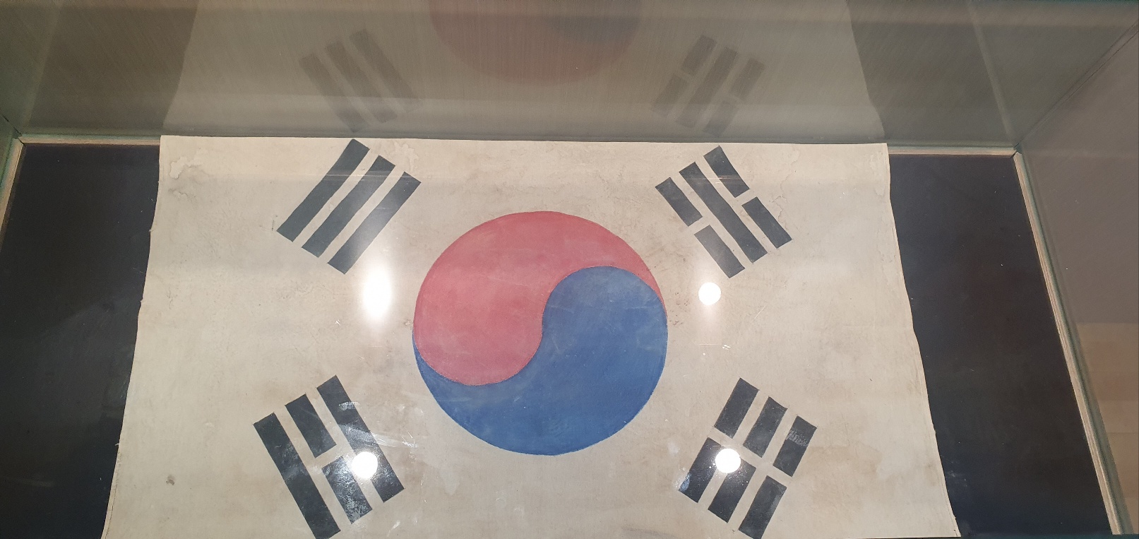 (졸업생 김반수 씨가 증언한, 만세 운동을 위해 여학생들이 태극기를 만든 일화가 태극기와 함께 전시되어 있다.)