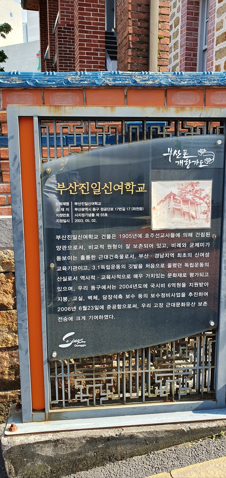지시를 따라 다시 오르막을 오르면, 거기에 붉은 벽돌로 지은 옛 일신여학교 건물이 나타난다. 부산광역시 동구 정공단로 17번길에 남은 이 2층 건물은 한국기독교 사적 7호이자 2003년 부산시 기념물로 지정된 문화재이기도 하다.