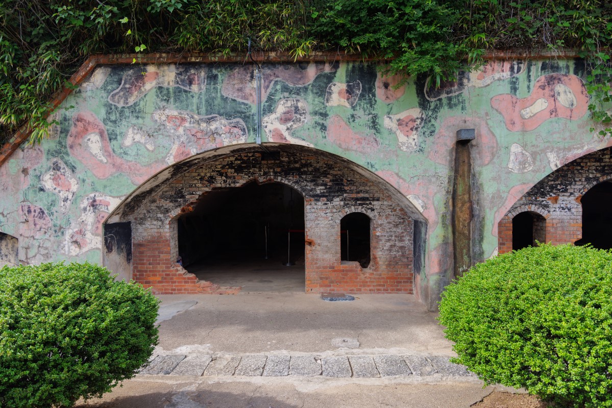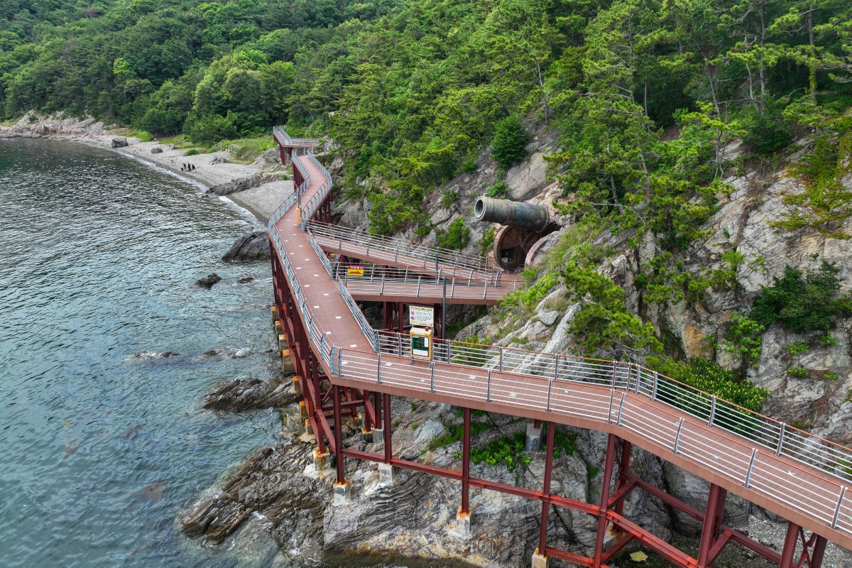 바닷가를 따라 놓인 데크길을 따라 가면 커다란 포를 내건 동굴 입구가 나타난다.