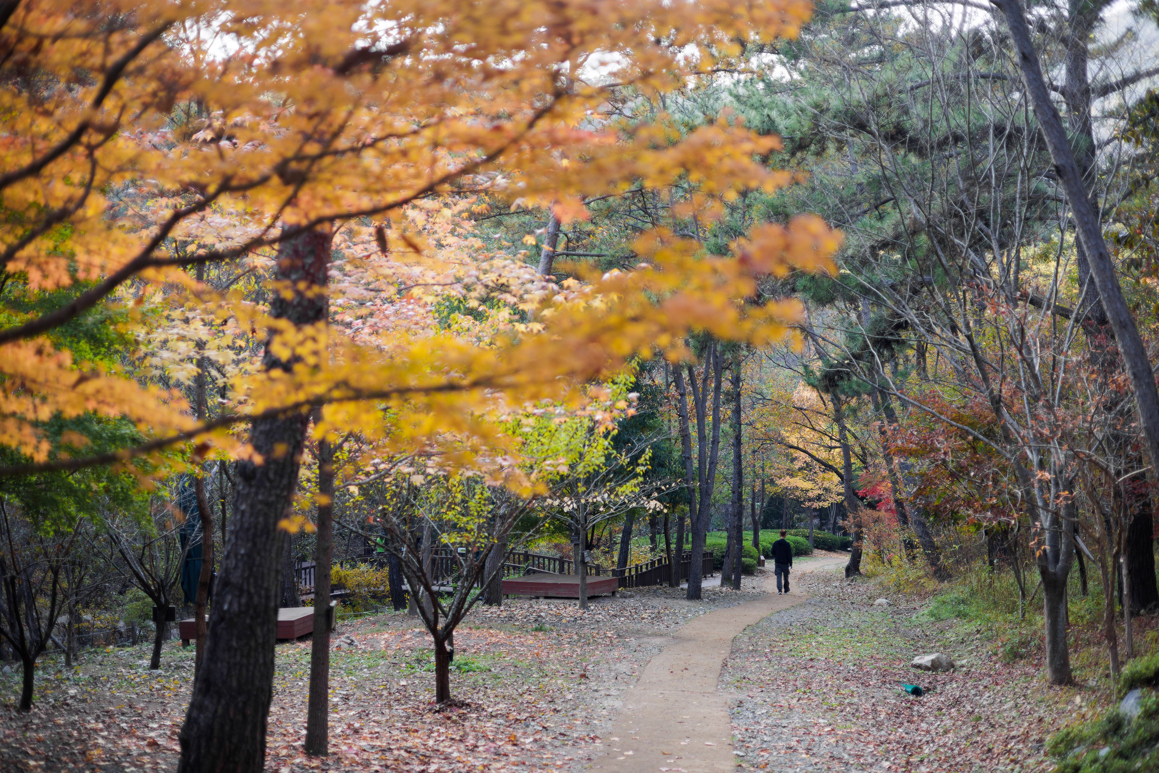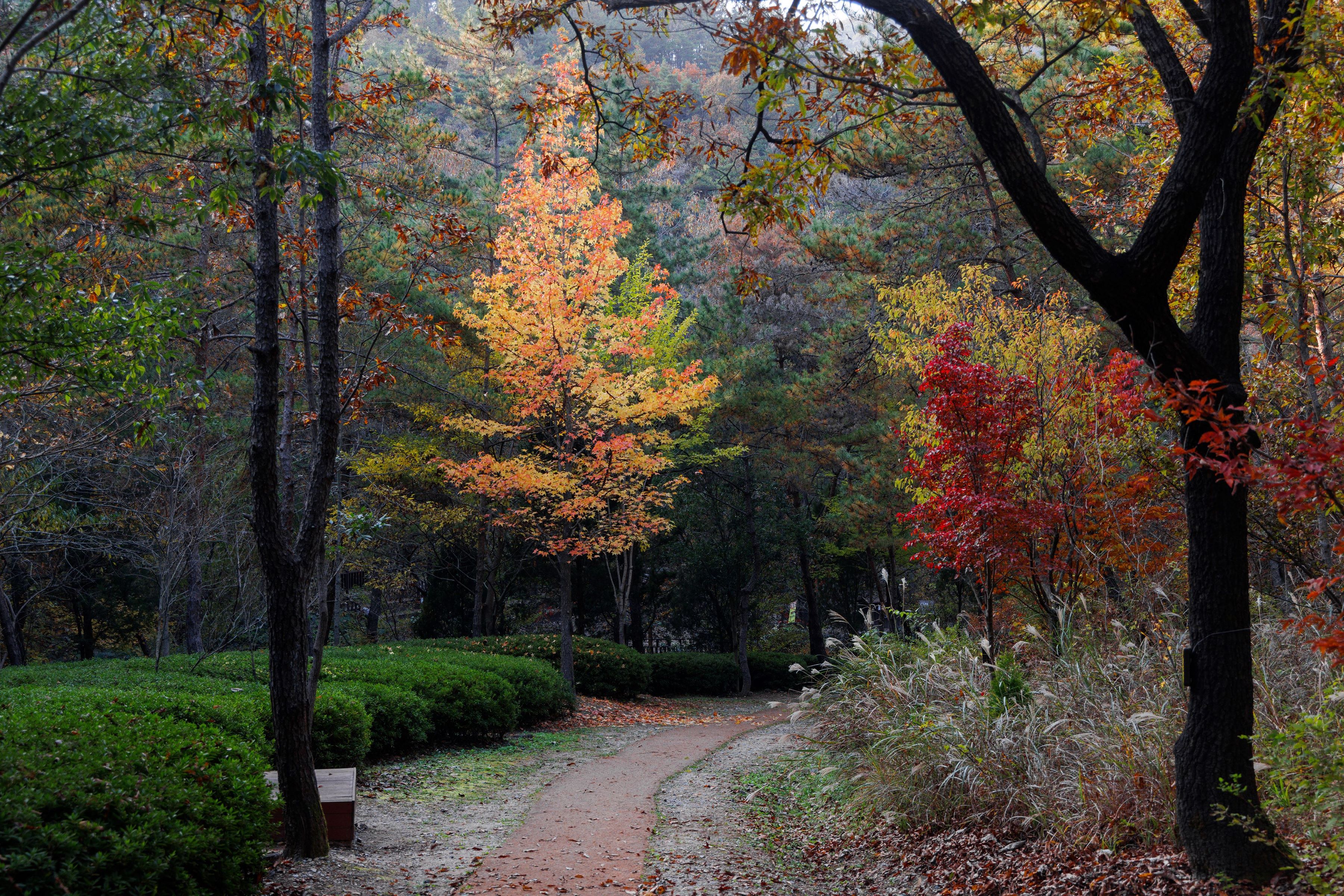 붉게 물든 단풍나무 한 그루가 우뚝 서 있는 입구로 들어서면 작은 계곡을 따라 산책로가 울창한 숲으로 깊숙이 이어진다.