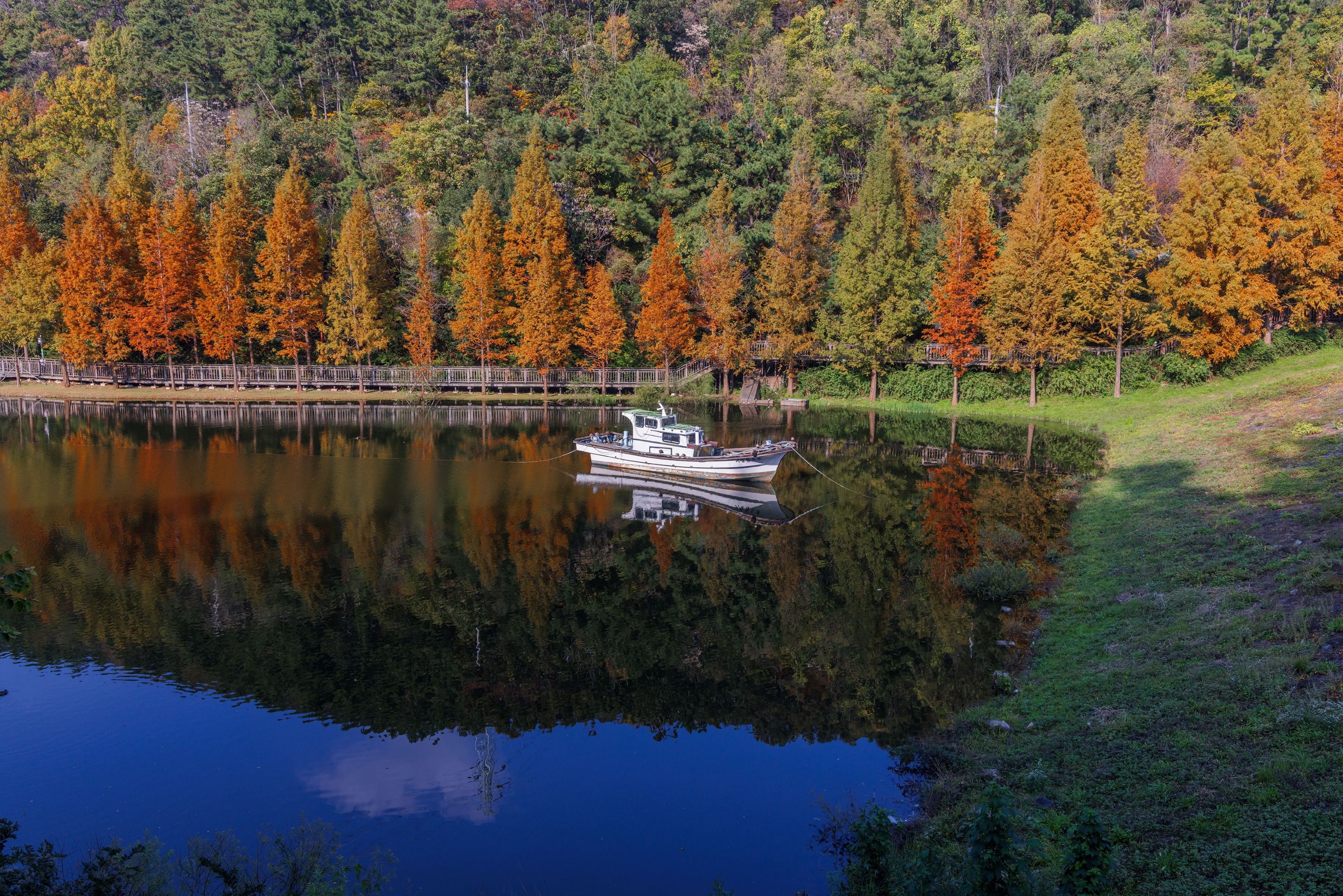 붉게 물든 메타세쿼이아 나무들이 줄지어 선 작은 연못에 배 한 척이 떠 있다.
