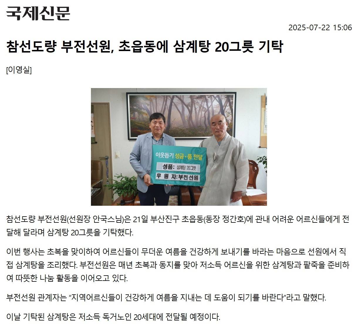 [초읍동] 참선도량 부전선원, 초읍동에 삼계탕 20그릇 기탁