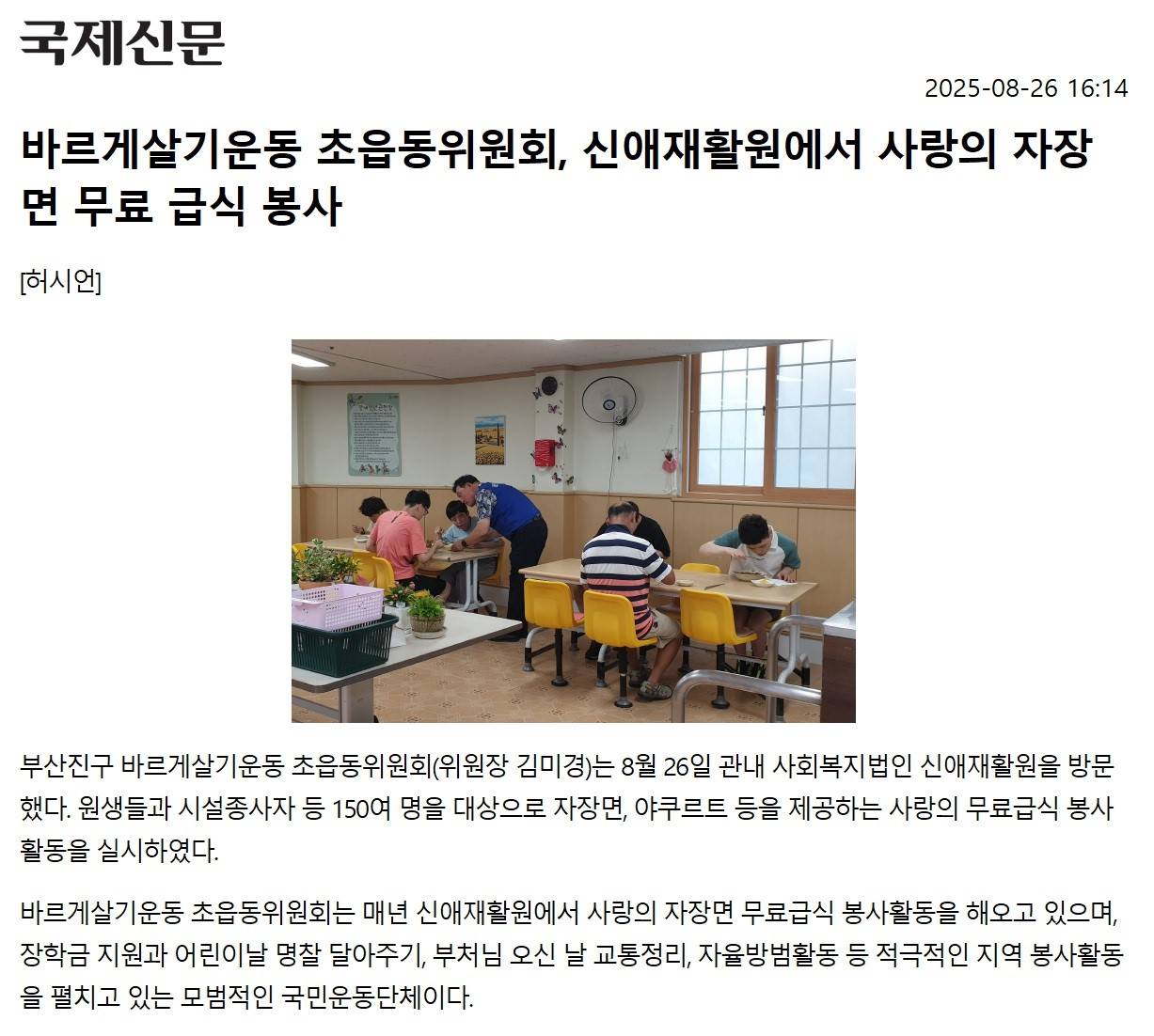 [초읍동] 바르게살기운동 초읍동위원회, 신애재활원에서 사랑의 자장면 무료 급식 봉사