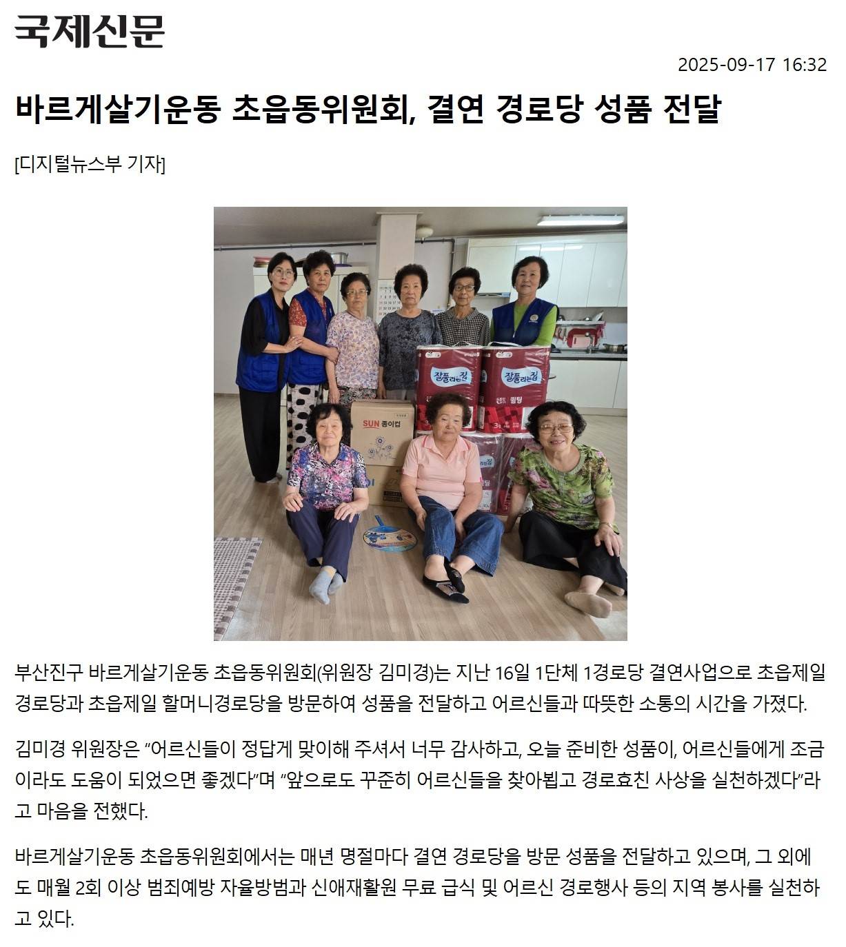 [초읍동] 바르게살기운동 초읍동위원회, 결연 경로당 성품 전달