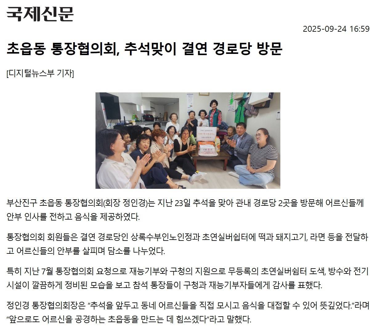 [초읍동] 통장협의회, 추석맞이 결연 경로당 방문