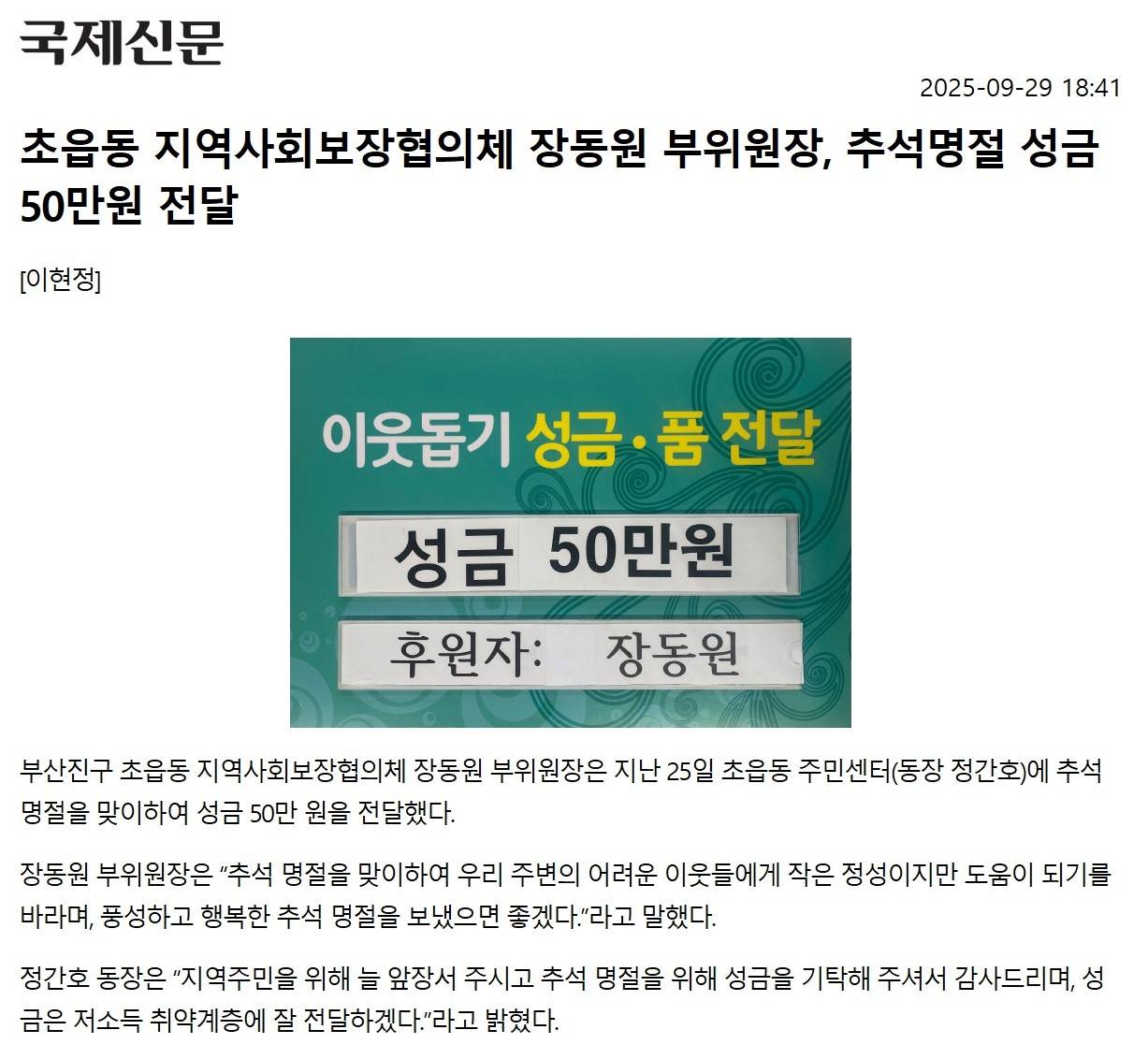 [초읍동] 지역사회보장협의체 장동원 부위원장, 추석명절성금 50만원 전달