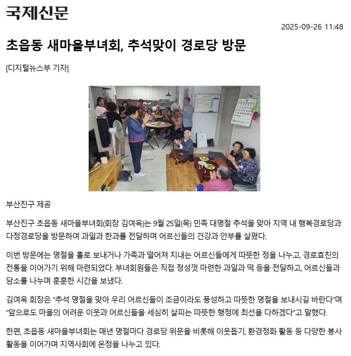 [초읍동] 새마을부녀회, 추석맞이 경로당 방문