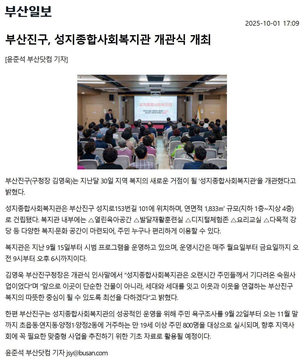 [초읍동] 부산진구, 성지종합사회복지관 개관식 개최