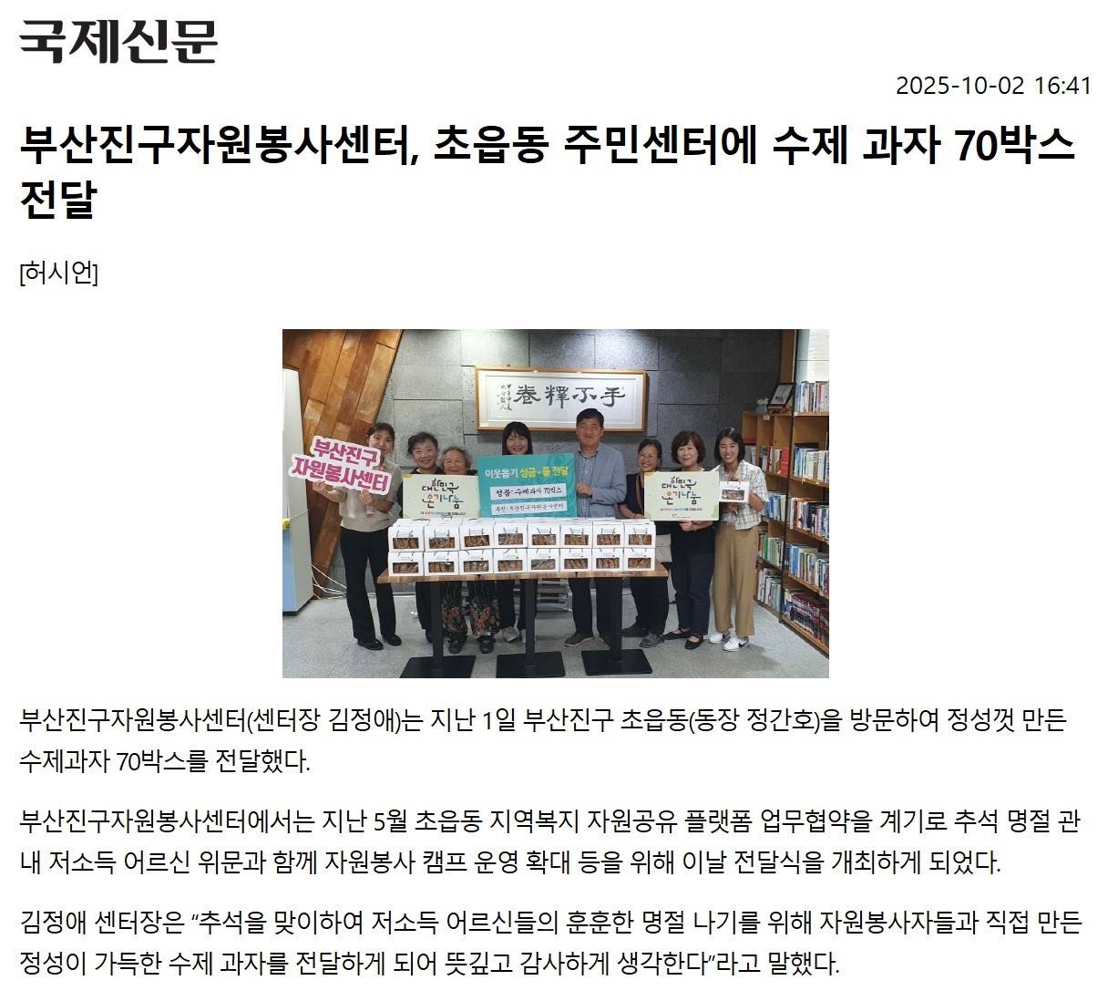 [초읍동] 부산진구자원봉사센터, 초읍동 주민센터에 수제 과자 70박스 전달