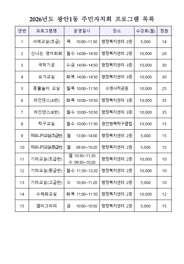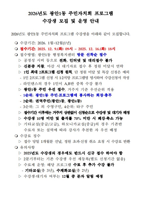 2026년 광안1동 주민자치회 프로그램 수강생 모집