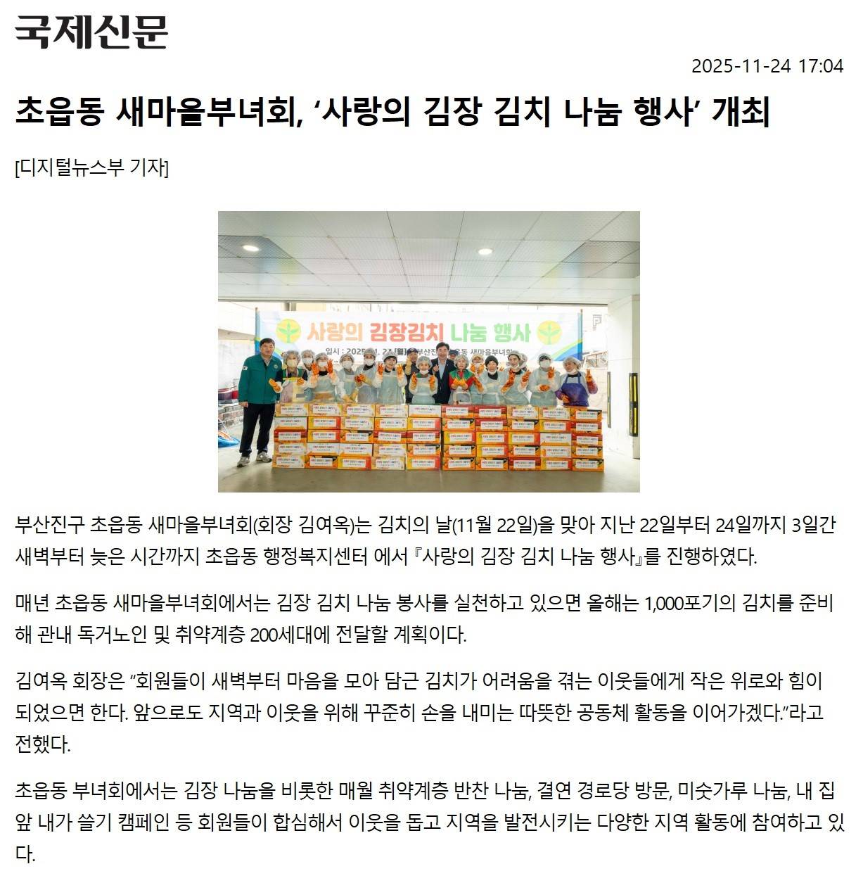 [초읍동] 새마을부녀회, 사랑의 김장 김치 나눔 행사 개최