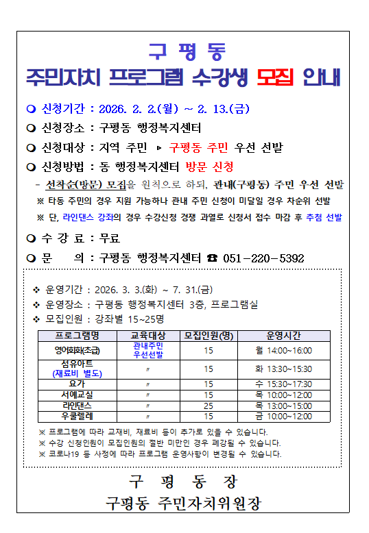 [구평동] 2026년 상반기 구평동 주민자치 프로그램 수강생 모집 안내