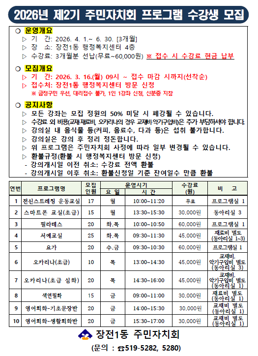 [장전1동] 2026년 제2기 주민자치회 프로그램 수강생 모집