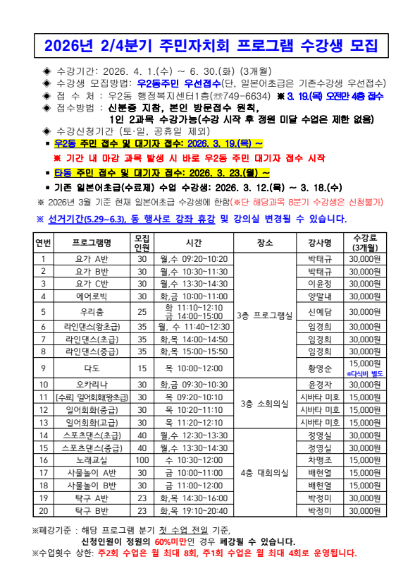 [우2동] 2026년 2분기 주민자치회 프로그램 수강생 모집