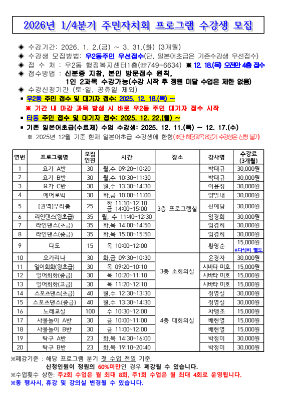 [우2동] 2026년 1분기 주민자치회 프로그램 수강생 모집