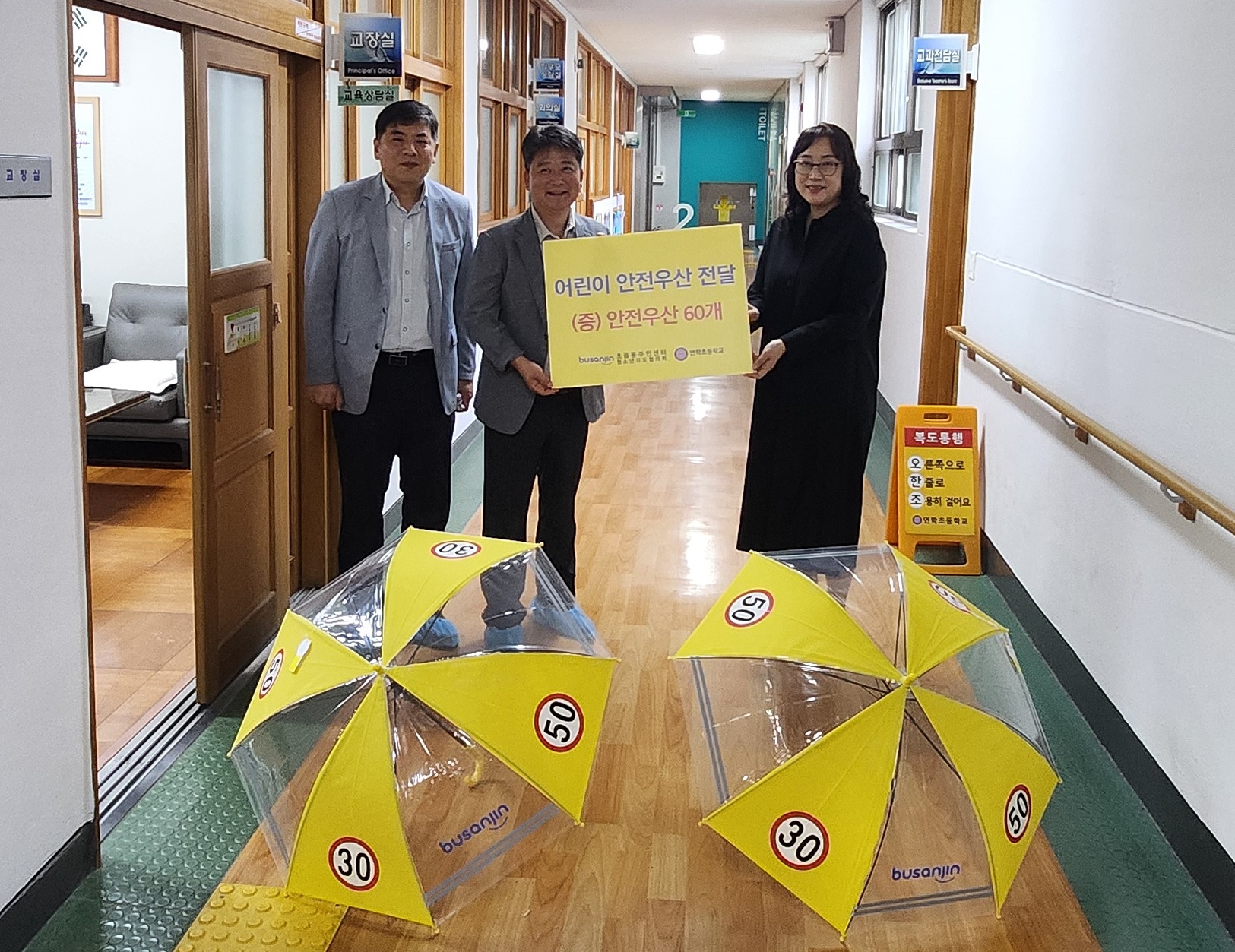 초읍동 청소년지도협의회(회장 탁귀남)는 지난 16일 관내 초등학교 어린이 안전용품 보급 및 캠페인(1)의 일환으로 연학초등학교을 방문해 교통사고 예방을 위한 안전우산 60개를 전달했다.