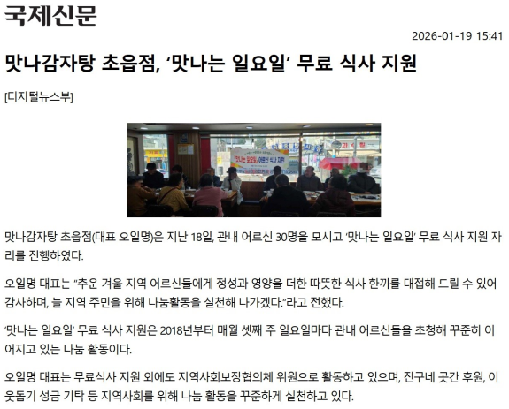 [초읍동] 맛나감자탕 초읍점, 어르신 무료식사 지원