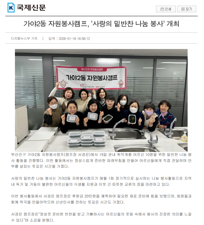 [가야2동]가야2동 자원봉사캠프, 사랑의 밑반찬 나눔봉사 개최