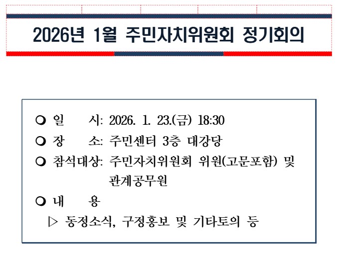 ※ 읍면동 주민자치위원회 회의록 입니다. 세부내용에 대한 문의는 해당 읍면동으로 전화하시기 바랍니다.
