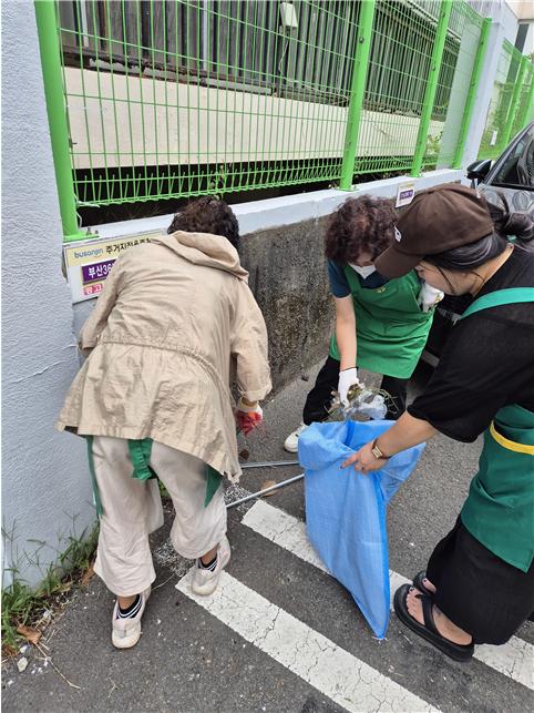 이날 환경정비에는 새마을부녀회 회원 10여 명이 참여하여 초읍천로의 관내 불결지를 정비하는 활동과 정비구역 내 사업소를 방문하여 쓰레기 분리배출 안내를 실시하였다.