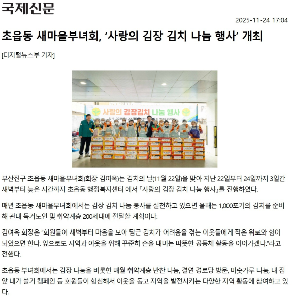 [초읍동]초읍동 새마을부녀회, ‘사랑의 김장 김치 나눔 행사’ 개최