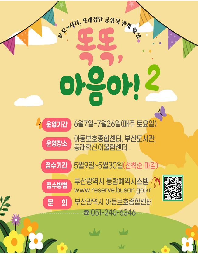 부산시 아동보호종합센터는 또래 관계 간 사회성 향상, 부모-자녀 간 의사소통과 상호작용 증진을 위해 진행하는 ‘똑똑, 마음아!’ 프로그램 참가자를 모집한다. 제2차 집단심리 프로그램 ‘똑똑, 마음아!’ 운영은 지난 10일까지 진행된 1차에 이어, 오는 6월 7일~7월 26일 2차로 진행되며, 3차는 8월에 진행될 예정이다.