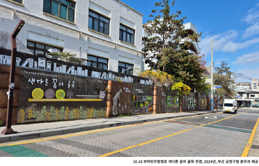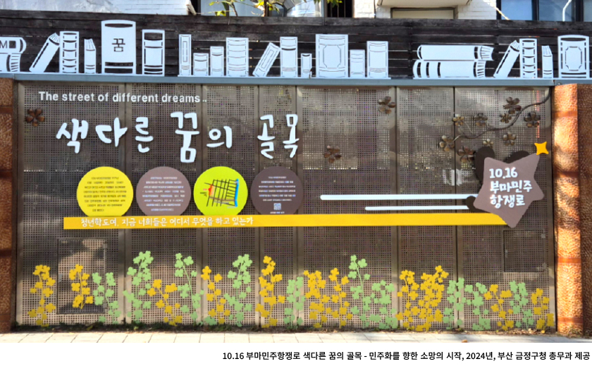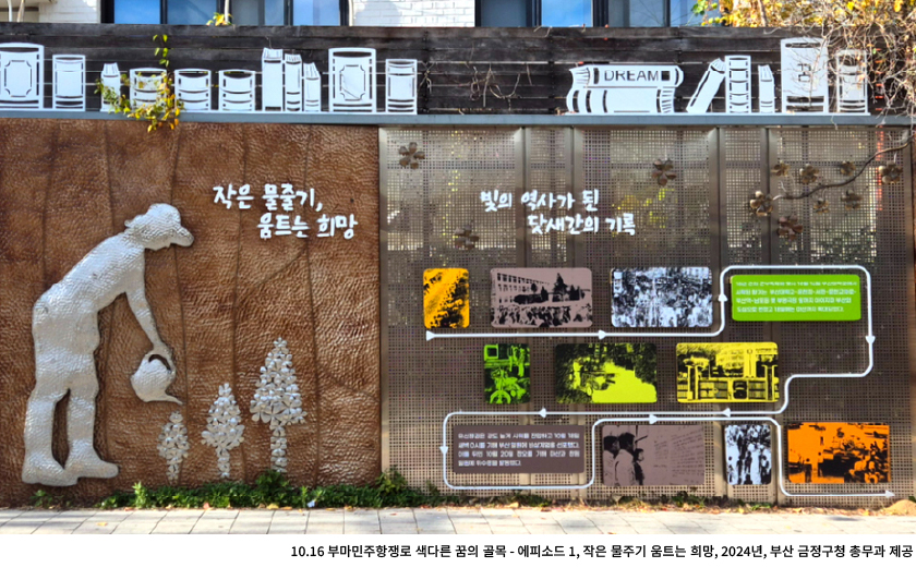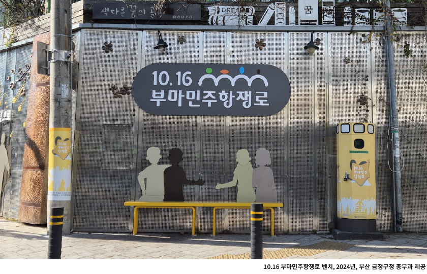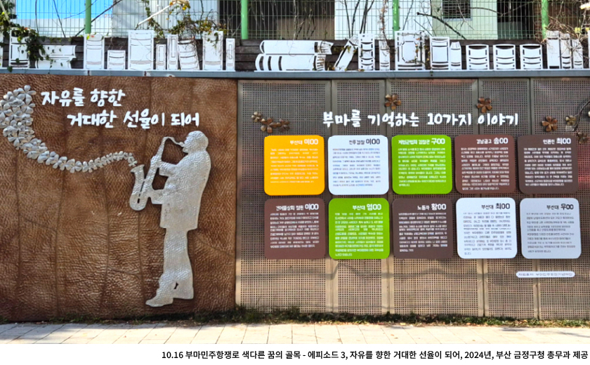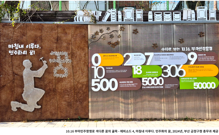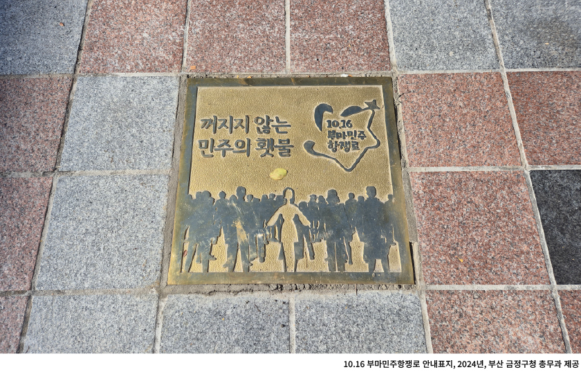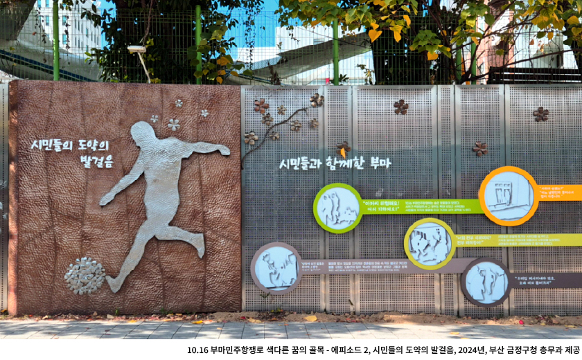 2023년 9월, 당시 학생들이 실제로 행진했던 부산대 정문 앞에서 도시철도 부산대역까지 이어지는 440m 구간이 '10·16 부마민주항쟁로'로 지정되었습니다. 그리고 2024년에는 행정, 학계, 시민, 관련 단체, 디자인 전문가가 함께한 민관 협치 실무단이 꾸려져 명예거리 조성사업을 추진했습니다. 학생들이 담장을 넘어섰던 자리에는 상징물이 세워지고, 바닥에는 동판이 박히며, 벽면에는 이야기판과 사진이 걸렸습니다. 추진 과정에서 가장 중요하게 여겨진 것은 항쟁 당사자와 시민들의 의견을 반영하는 것이었다고 합니다. 작은 표지판 하나, 디자인의 색감 하나에도 시민들의 뜻이 담겨 있으며, '이 길은 우리 모두의 민주주의를 위한 길'이라는 정신을 전하고 있습니다.