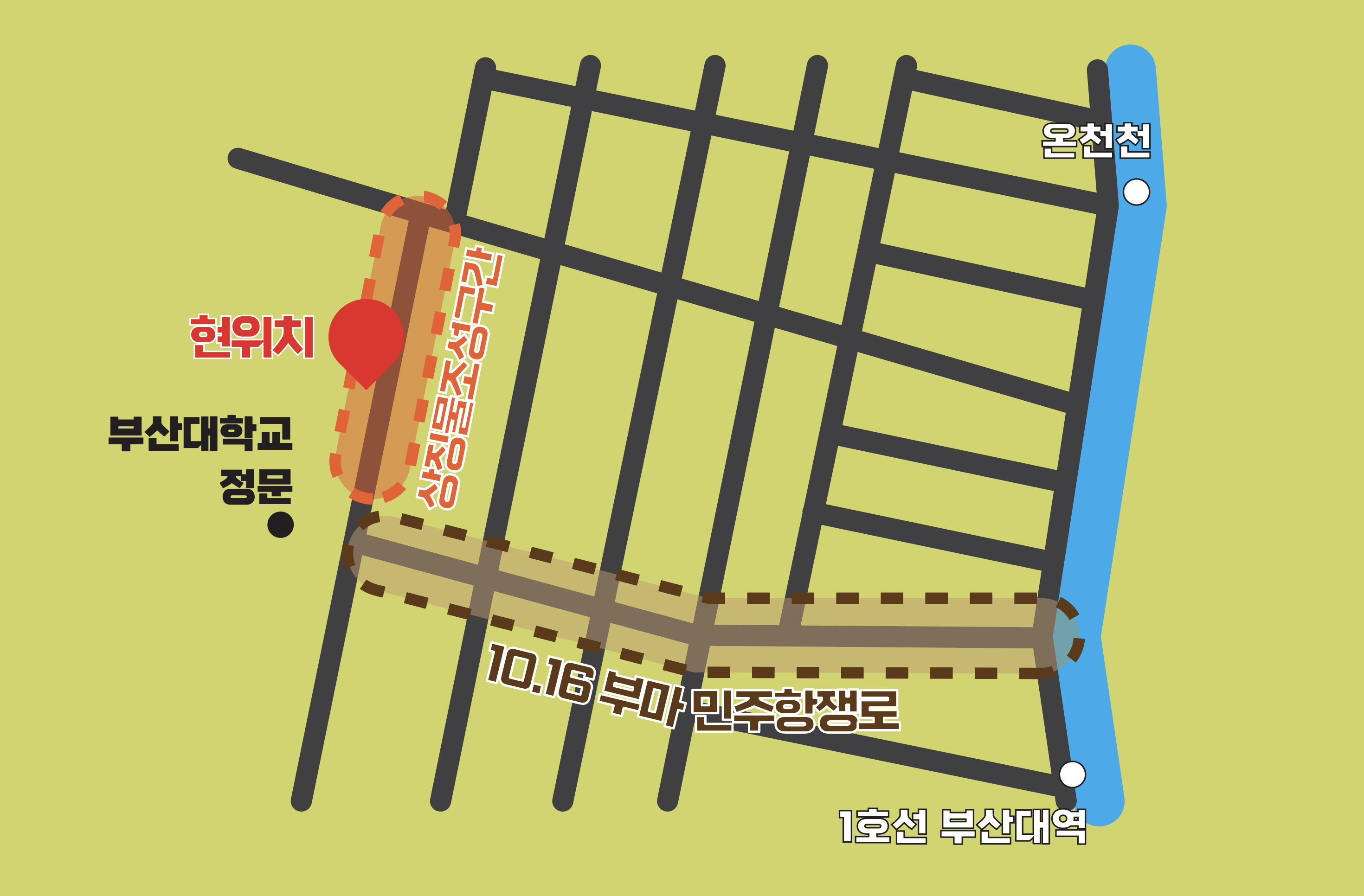 당시 부산대 도서관 앞에는 먼저 500여 명의 학생이 모였습니다. 하지만 교문을 나가 가두시위를 시작할 때는 그 인원이 5천여 명으로 늘어났습니다. "유신 철폐, 독재 타도!" 그들은 담벼락을 넘어 도심으로 향했고, 외침은 부산과 마산을 울리며 유신 독재를 흔들었습니다. 처음에는 그저 평범한 대학가 도로처럼 보였지만, 걸음을 옮길수록 여기가 민주주의의 역사를 품은 장소라는 걸 온몸으로 느끼게 되었습니다.