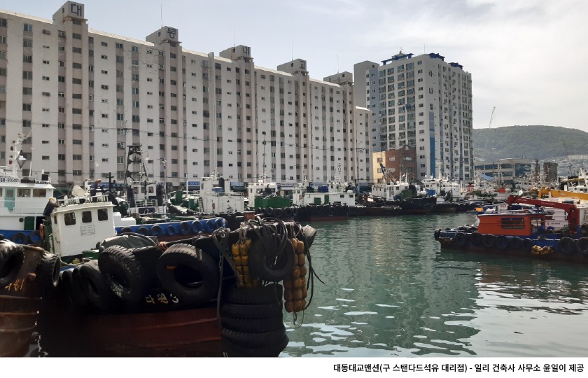 바다와 연결된 선대 위에 거대한 선박을 수리하고 있는 우리조선소 부지는 우리나라 최초의 근대식 조선소인 다나카조선소(田中造船所)가 대평포 매립공사(1916∼1926년) 후 이전해 온 곳입니다. 대평물양장에 위치한 동명기술 창고는 일제강점기 조선질소비료주식회사(朝鮮窒素肥料株式會社, 1934∼1936년경)의 창고였는데, 목재 기둥·보, 블록 벽체, 목재 트러스와 슬레이트 지붕 등 옛 구조가 잘 보존되어 있으며, 세 개의 삼각 박공 외관은 이 지역의 랜드마크 역할을 하고 있습니다. 인접한 1980년대 세워진 우리나라 최초의 주공 복합아파트인 대동대교맨션 부지는 1909년 부산의 선각자 박기종이 미국계 스탠다드석유 대리점을 설립했던 역사적인 장소이자, 해방 후 승리창고가 운영되던 곳으로 다양한 시대의 흔적을 담고 있습니다.