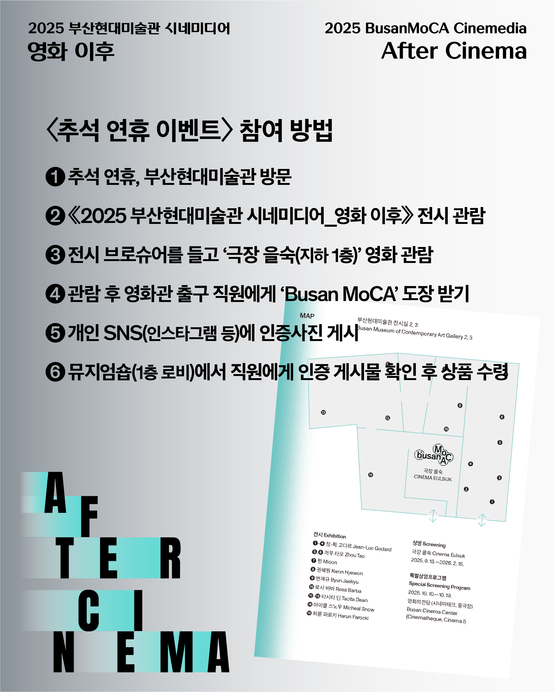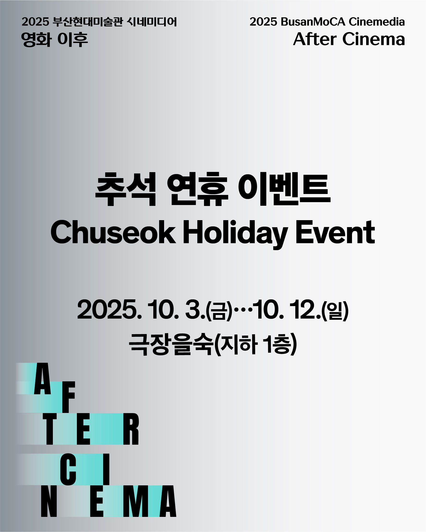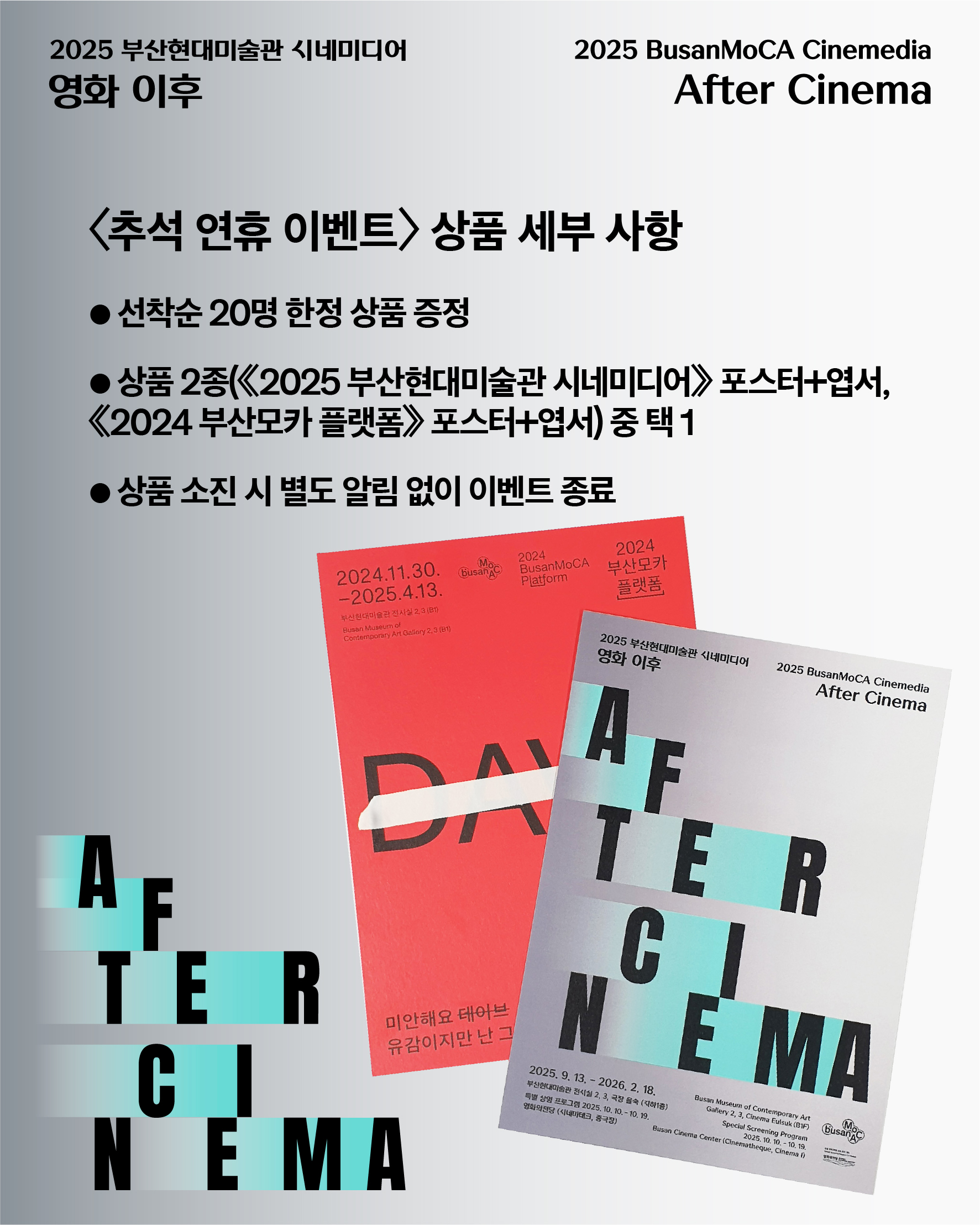 부산현대미술관은 《2025 부산현대미술관 시네미디어_영화 이후》 전시와 연계하여 추석 연휴 이벤트를 진행합니다.