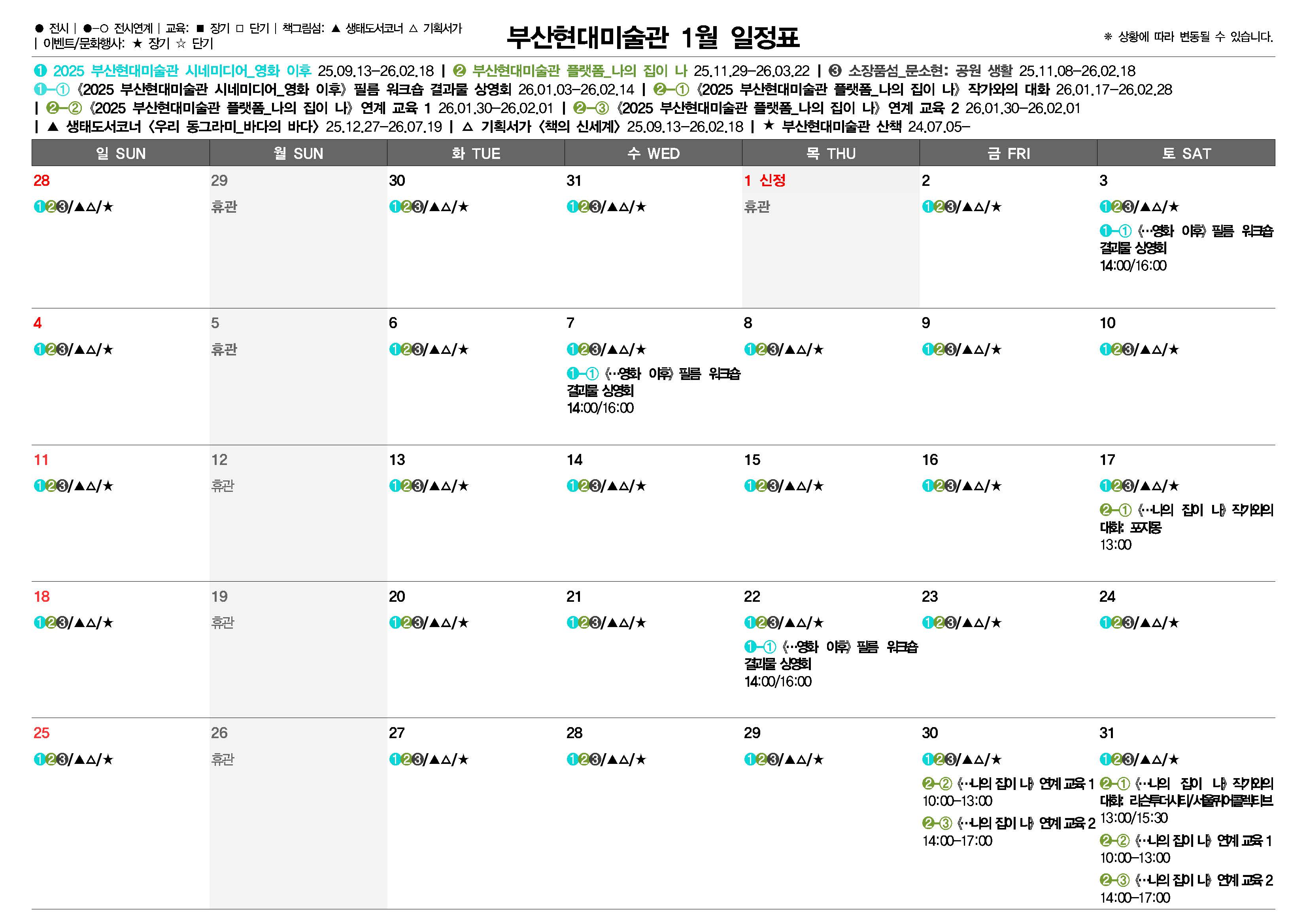 부산현대미술관 월별 일정(2026.01) 안내 드립니다. 관람 및 이용에 참고하시기 바랍니다.
